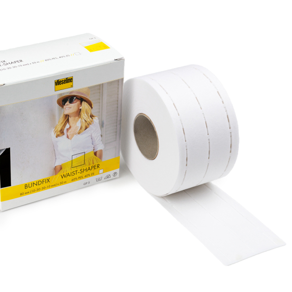 Le linee di punzonatura evitano marcature e disegni di linee di rottura e servono allo stesso tempo da linee guida durante la cucitura. La cintura mantiene stabilmente la propria forma. Particolarmente adatto anche a lavorare in modo preciso i manici delle borse. Descrizione dell’impiego: 1- Stirare Cinturfix sulla cintura di stoffa già tagliata utilizzando il calore a secco e la pressione. 2- Piegare la cintura al centro e stirarne preliminarmente il bordo. 3- Cucire la cintura alla gonna (o pantalone) lungo la linea di punzonatura. 4- Cucire il bordo di giunzione e risvoltare; cucire, se desiderato, la fodera della gonna o del pantalone alla cintura. 5- Infine trapuntare la cintura rovesciata dal lato dritto attraverso la cucitura. Utilizzo per: Pressoché tutti i tessuti Vantaggi del prodotto: – senza disegno e marcatura delle linee di rottura – lavorazione sicura e facile – bordi sottili e precisi