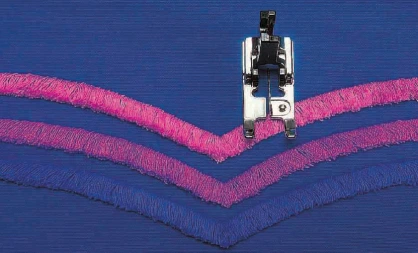 Sia che venga usato con punti utili oppure con punti decorativi, questo piedino vi permetterà di realizzare punti tipo imbastitura, frange e motivi effetto ciniglia. La barretta metallica presente al centro del piedino consente al filo di rimanere sollevato per uno spendido risultato ad effetto.